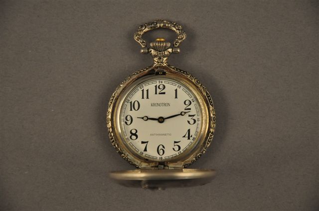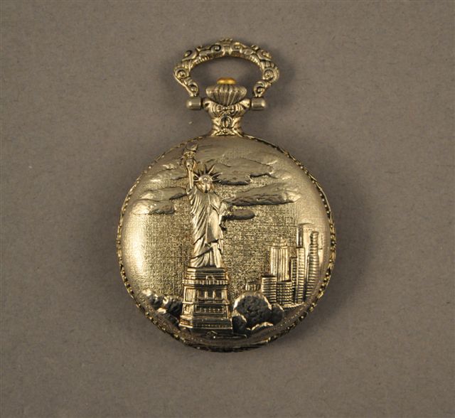 MONTRE de GOUSSET en métal à décor reproduisant la Statue de la Liberté et motifs rocaille, cadran à chiffres arabes marqué KRONOTRON.