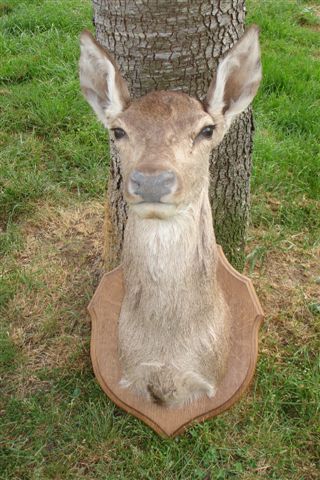 Tête de BICHE naturalisée, fixée sur un écusson en bois.