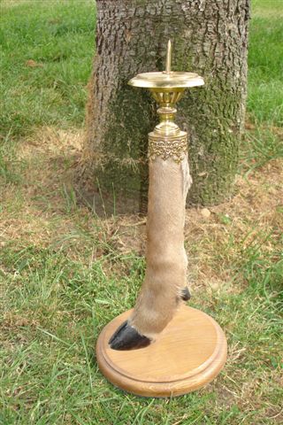 Pied de cervidé monté en PIQUE-CIERGE, sur un socle en bois.