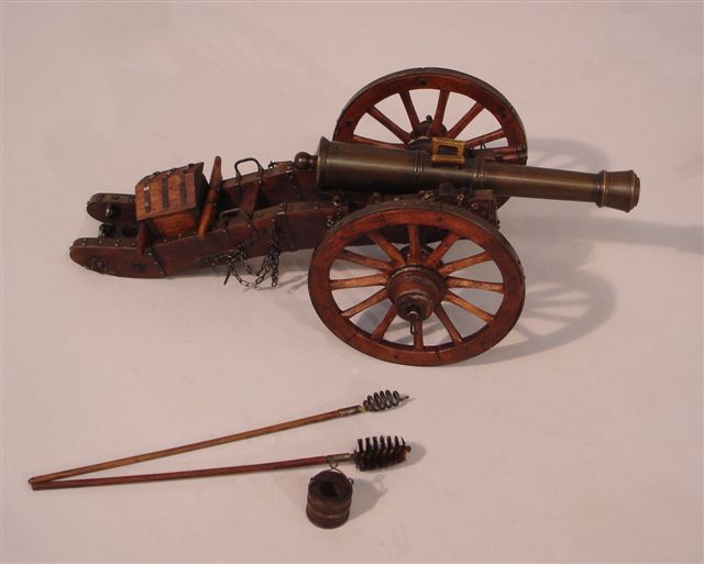 MAQUETTE D'UNE PIÈCE D'ARTILLERIE GRIBEAUVAL PREMIER EMPIRE. Échelle 1/10. (33 cm, 1035 gr). Affût aux crosses renforcées de bandes de fer. Roues à rayons cerclées de fer. Position route et position tir. Le tube à bourrelet et deux poignées de déplacement. Accessoires : seau, goupillon et refouloir.