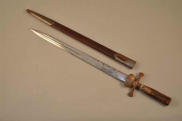 DAGUE de vènerie, lame avec une gouttière, poignée en corne et virole, garde à deux quillons et palmettes, fourreau cuir à deux garnitures acier. XIXème. Long. avec fourreau : 62 cm.( piqûres)