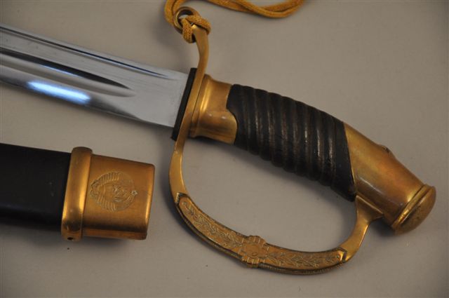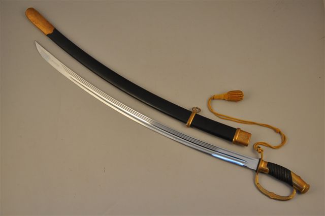 SABRE russe, poignée bois noirci, garde en laiton à une branche et quillon, lame à pan creux et gouttièresavec fourreau un anneau garnitures laiton avec motif faucille et marteau. Long. avec fourreau : 99 cm.