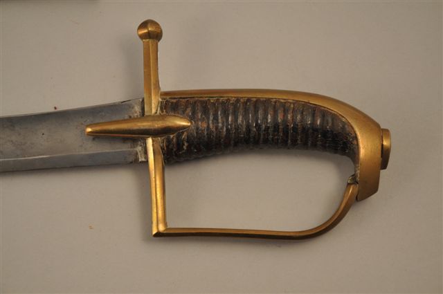 SABRE réglementaire de hussard mod. an 4, garde en laiton à une seule branche, quillon et 2 oreillons, fusée recouverte de cuir, lame à pan creux et tranchant, sans marquage, fourreau cuir, 2 bélières, 2 garnitures en laiton et dard en fer, bon état général. Long avec fourreau : 104 cm. (fourreau en mauvais état, encoche au tranchant en partie médiane, piqûres, chocs aux garnitures)