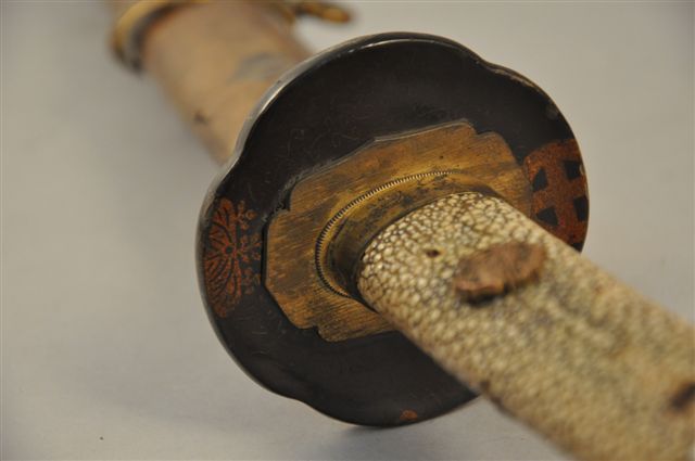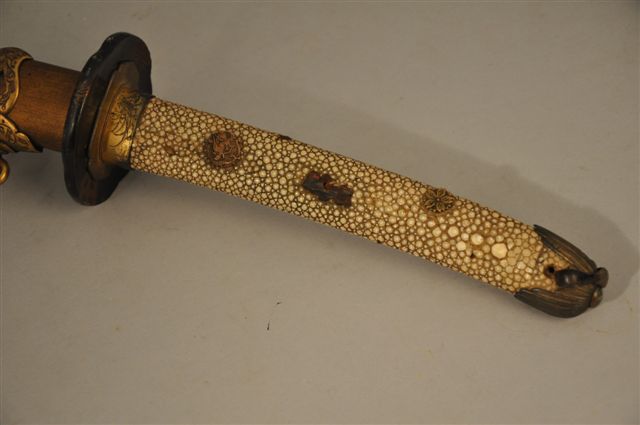 SABRE Katana, poignée galuchat appliquée de motifs de fleurs et de dragons, tsuba à patine brune, fourreau en laque or, garniture gravée à deux anneaux en bronze doré. JAPON. Long. de la lame : 73,5 cm.