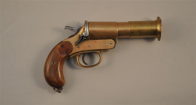 PISTOLET de signalisation WEBLEY et SCOTT Ltd, LONDON et BIRMINGHAM, simple action, canon basculant, laiton et plaquettes acajou.