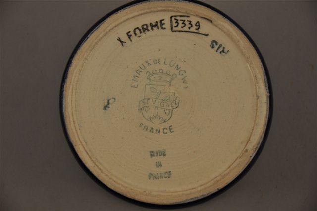 LONGWY. BONBONNIÈRE ronde. Décor à fleurs polychromes sur fond bleu. Entourage en bleu de Sèvres. Marque : blason simple Sévigné. F : 3339. Haut. 5, Diam. 9 cm.