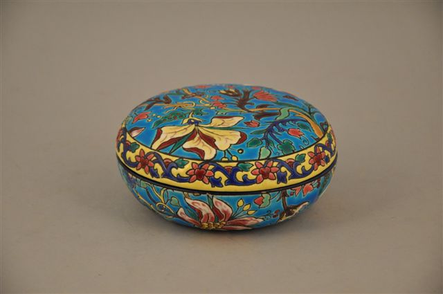 LONGWY. BONBONNIÈRE à décor luxuriant à fleurs d'orchidées et branches fleuries sinueuses posées sur un fond bleu Longwy. Frise de fleurettes et entrelacs sur le bord du couvercle bombé. Rebord de la boîte en bleu de Sèvres. Début XXème siècle. Marque : Blason simple. Haut. 6,5, Diam. 14,5 cm.