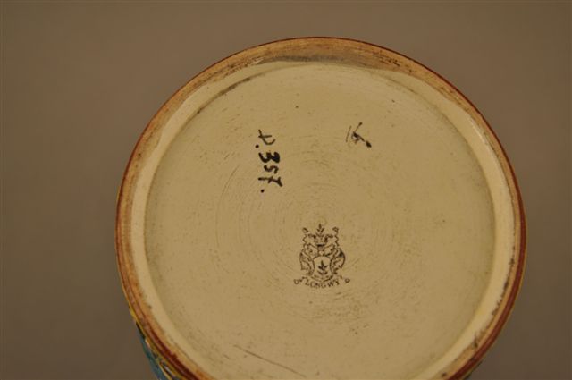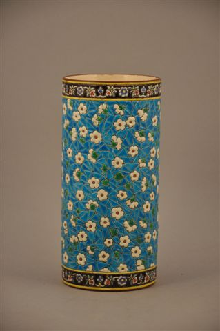 LONGWY. Important VASE rouleau. La faïence bleue est décorée d'un motif réticulaire : Le semis de fleurettes blanches sur fond découpé en modules irréguliers (fait référence à un motif chinois publié par l'ornemantiste et architecte anglais Owen Jones (1809-1874)). Deux frises décorées de fleurs sur fond de couleur aubergine. Liserés jaunes. Epoque 1871-1890. Decor : 357. Marque : "au heaume des HUART". Haut. 25,5, Diam. 12 cm.