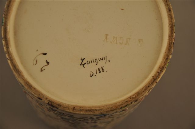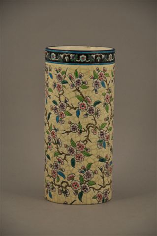 LONGWY. Important VASE rouleau. Décor 188 à fleurs de pommiers finement réhaussées sur fond crème; frise au col. XIXème. Marque : Longwy en creux + Longwy manuscrit. Haut. 25,5, Diam. 11,7 cm.