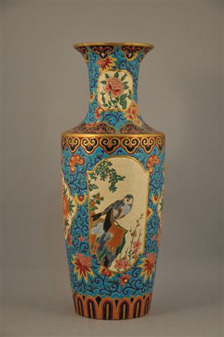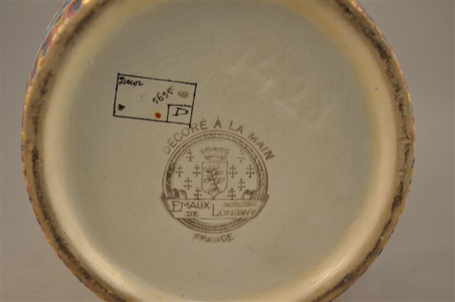 LONGWY. VASE de forme balustre. Décor plein d'un semis de fleurs polychromes et branchages fleuris sur fond bleu d'inspiration persane. Quatre cartels sur le corps à décor d'oiseaux et fleurs exotiques sur fond crème craquelé. Bordure extérieure et talon à frise de motifs géométriques sur fond "bleu de Sèvres". Rehauts d'or. Marque manuscrite en noir D 5655. Marque : Cachet blason simple à la feuille de houx couronné, entouré d'un semis de Dix Croix de Lorraine avec la mention "ÉMAUX DE LONGWY FRANCE". Haut. 58 cm.