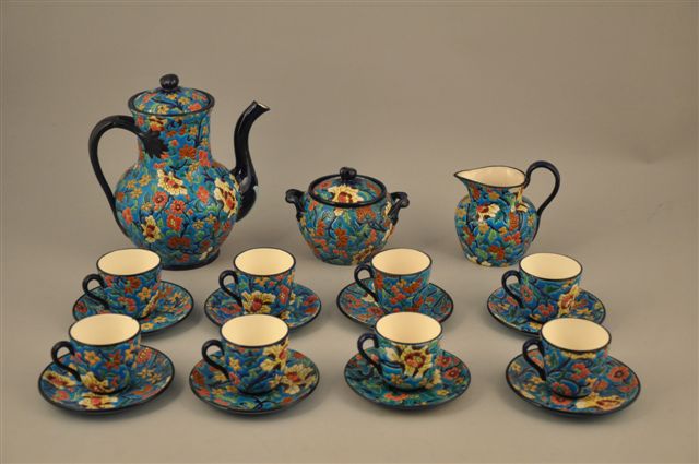 LONGWY. SERVICE À CAFÉ de 19 pièces comprenant 8 tasses, 8 sous-tasses, 1 sucrier, 1 pot à lait (accidenté) et 1 cafetière. Décor plein de branchages fleuris et feuillagés sur fond bleu. Bordure et talon en "bleu de Sèvres". Marques : Blason orné d'une branche de houx, couronné et cachet imprimé orange LONGWY (tasses et sous-tasses); Blason simple couronné avec la mention : "DÉCORÉ À LA MAIN - ÉMAUX DE LONGWY - FRANCE" (sous-tasses, cafetière, pot à lait); Petit Longwy en ligne en creux dans un rond et D 20 (sucrier).