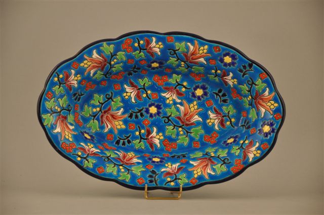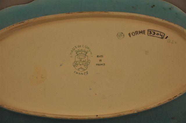 LONGWY. COUPE de forme "barquette" à bords ondulants. Décor intérieur de fleurs de pommier framboise, bleu et blanc à coeur jaune sur fond bleu turquoise craquelé. Décor extérieur bleu céruléen craquelé. Bordure extérieure émaillée "Bleu de Sèvres". Marque imprimée : Blason à la feuille de houx couronné et cachet imprimé avec la mention "ÉMAUX DE LONGWY FRANCE - MADE IN FRANCE". Marque manuscrite : 3304.
