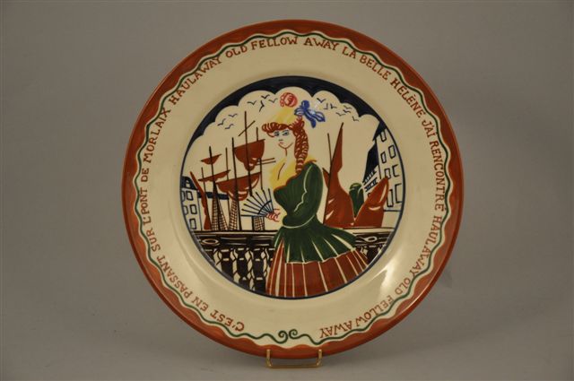 QUIMPER HB. LACHAUD J. PLAT creux décoré. Marque : "C'est en passant sur le pont de Morlaix Haulaway old Fellow away la Belle Hélène...". Diam. 31,5 cm.