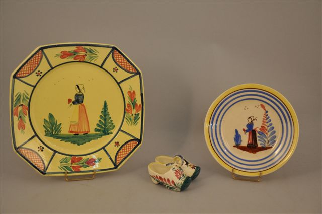 Joint HB QUIMPER. 2 pièces : une SOUS-TASSE à décor d'une bretonne, Diam. 16 cm. Paire de SABOT formant salerons à décor floral et d'une bretonne.