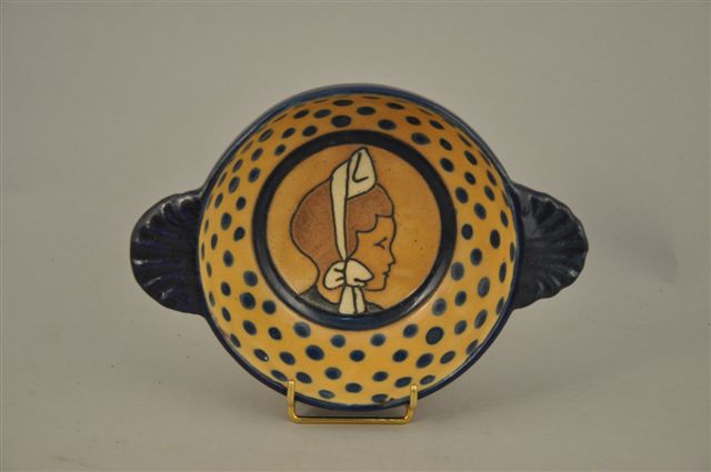 QUIMPER HB. ODETTA. BOL à oreilles en grès à décor de visage de bretonne.