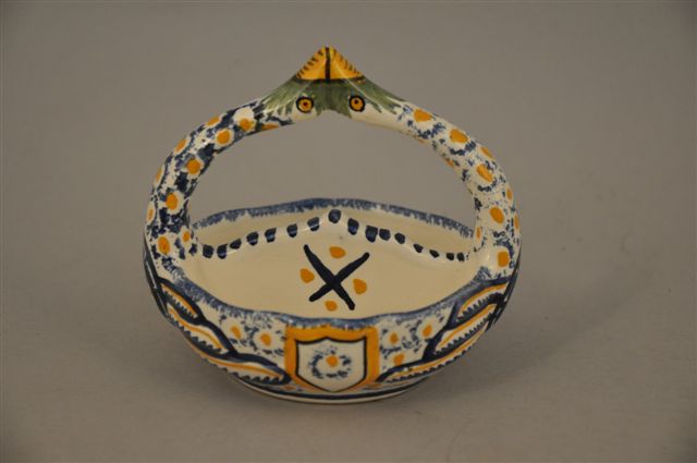 QUIMPER HENRIOT. SALIÈRE-POIVRIÈRE à décor de deux cygnes dont les cous forment l'anse. Marque 135.