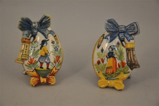 QUIMPER HB. 2 PORTE-MENUS en fome de biniou et à décor de personnage.