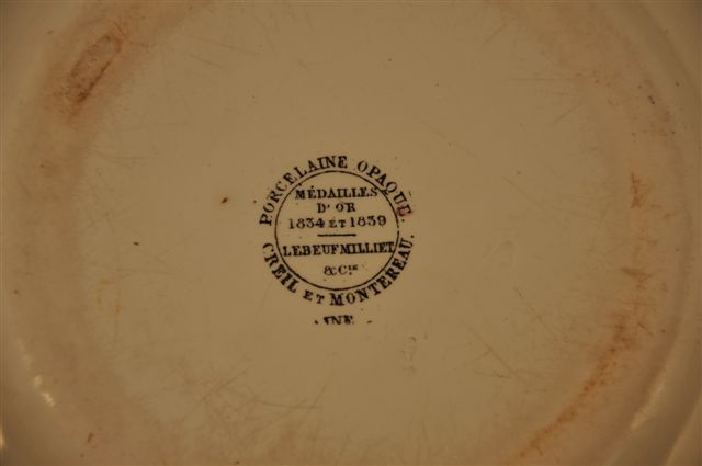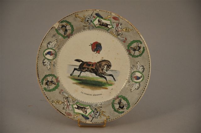 CREIL et MONTEREAU - ASSIETTE en faïence fine à décor imprimé en noir "La culbute aérienne", rehauts polychromes au pinceau. Marque en noir : Lebeuf et Millet et Cie. XIXème. Diam. 21 cm (éclats en bordure).
