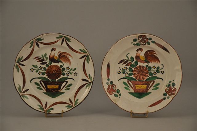 EST de la FRANCE. DEUX ASSIETTES en faïence polychrome à décor de panier fleuri et d'un coq. Fleurs stylisées et drapé aile légèrement polylobée. XIXème siècle. Diam. 23,5 cm.