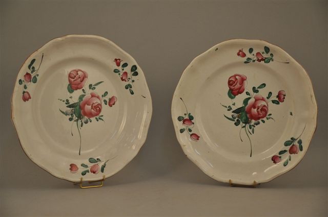 EST de la FRANCE. PAIRE de PLATS en faïence à décor polychrome de fleurs. XIXème. Diam. 29 cm.