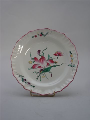 EST de la FRANCE. Assiette en faïence de petit feu, décor floral à la tulipe. Marquée d'une croix au revers en manganèse. Diam. 25 cm. XVIIIème.