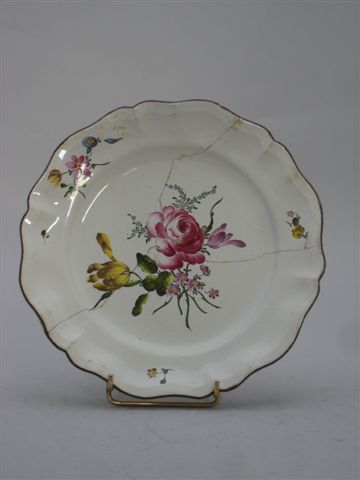 EST de la FRANCE. STRASBOURG. Assiette à aile polylobée à fin décor de fleurs au naturel, marque de HANNONG. Diam. 24,5 cm (accidentée, agraphes).