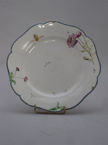 MARSEILLE, Manufacture de ROBERT. ASSIETTE en FAÏENCE polychrome, à décor floral de bouquets et d'insectes. Marquée "R" en bleu XVIIIème. Diam. 26,5 cm. (éclats).