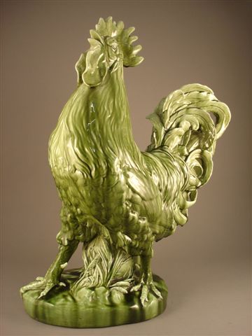 MASSIER Jérôme (1850-1926), attribué à. COQ en faïence verte émaillée. Fièrement campé sur ses ergots, et appuyé sur une gerbe de blé formant vase, le coq est représenté dans la position du chant du matin. Début XXème siècle. (léger accident à la terrasse).