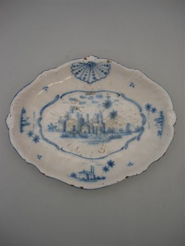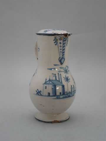 MONTPELLIER. AIGUIÈRE COUVERTE et son BASSIN en faïence de grand feu bleu et blanc, à décor de château et paysage. XVIIIème.