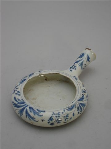 MOUSTIERS. CRACHOIR en faïence de grand feu à décor en camaïeu bleu de rinceaux fleuris. XVIIIème. Diam. 10,5 cm. (égrenures, éclats, fêle et restauration)