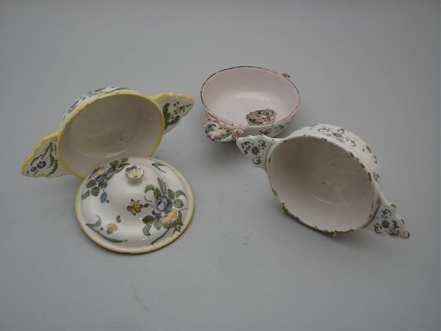 Hauteur l'écuelle avec son couvercle : 12 cm. (une anse accidentée).