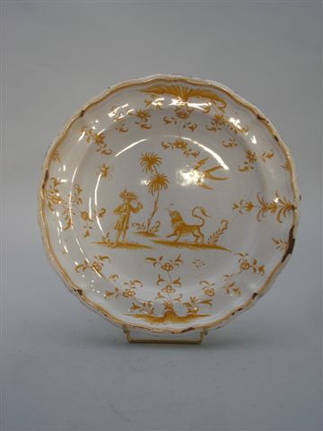 MOUSTIERS. GRAND PLAT creux de forme ronde en faïence de grand feu, à décor jaune de personnage vêtu à l'indienne et de lion sur fond crème. XVIIIème. Diam. 31 cm. (fêle, égrenures)