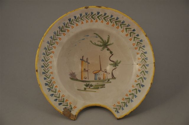 MOUSTIERS. PLAT À BARBE circulaire en faïence de grand feu. Décor polychrome dans le bassin, d'un paysage. (fêle et éclats). XIXème siècle. Haut. 9, Diam. 26,5 cm.