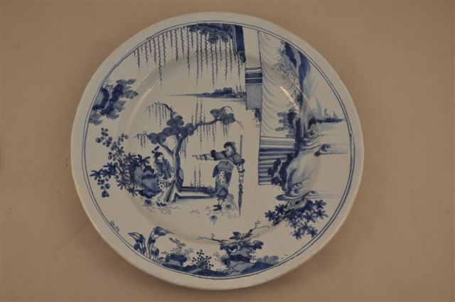 NEVERS. PLAT rond en faïence à décor en bleu d'un homme en armure et d'un mandarin, dans un paysage, dans le gôut de la chine. XVIIIème. Diam. 43 cm.