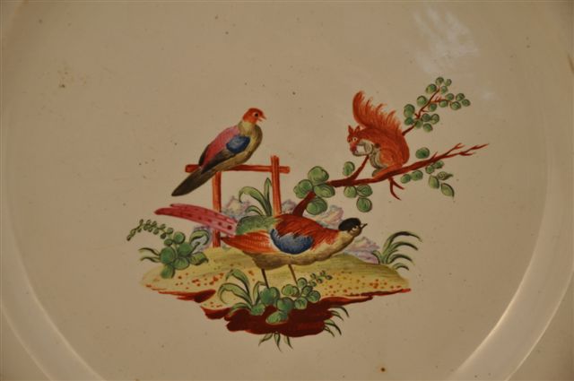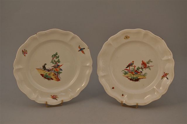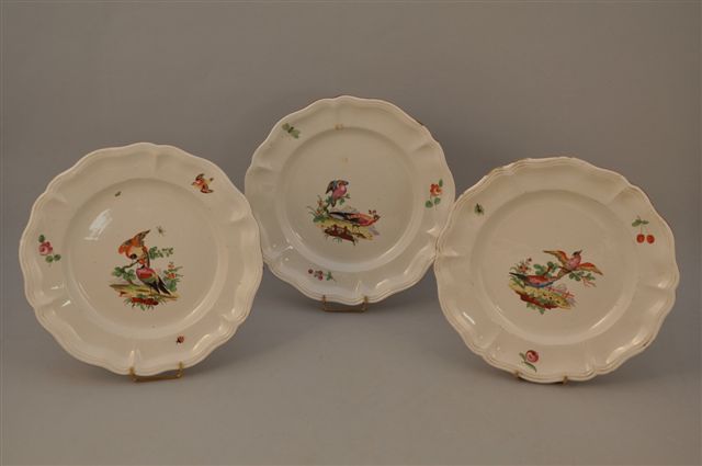 SCEAUX. J. CHAPELLE. 1760. CINQ ASSIETTES en faïence blanche, à décor polychrome d'oiseaux sur des branches, fruits, insectes et fleurs. . XIXème. Diam. 24 cm. (égrenures et restauration, sautes d'émail).