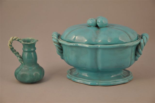 VALLAURIS - SOUPIÈRE couverte en céramique de couleur turquoise, attribuée à Gaziello, de forme mouvementée, prise latérales cordiformes, prise du couvercle aux trois fruits. 35 x 20 cm.