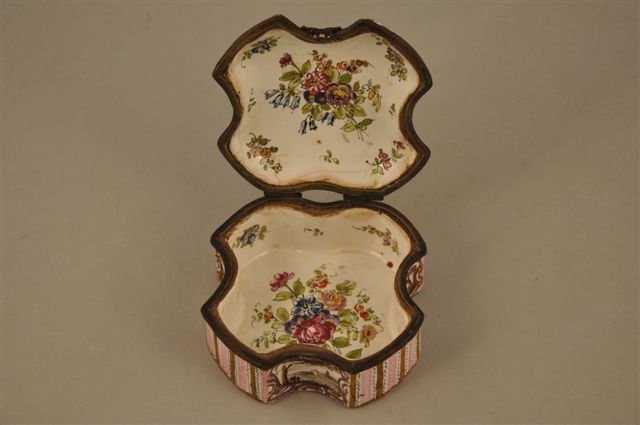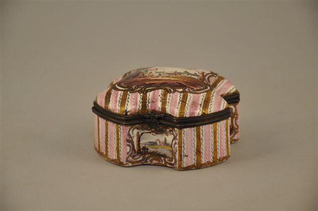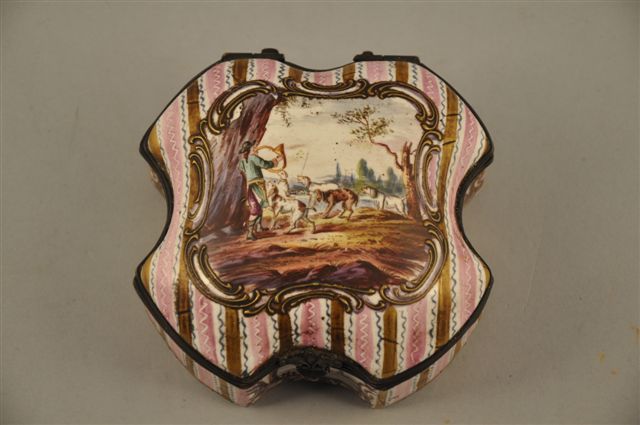 VARIA. BOÎTE en faïence polychrome de petit feu, de forme quatre feuilles, à décor dans des réserves à entourage rocaille doré en léger relief, de paysages et, sur le couvercle bombé, d'une scène de chasse représentant un sonneur entouré de chiens. Fond à rayures roses et or, l'intérieur peint de fleurs. Monture en bronze à fermoir coquille. Marqué CN. Dans le goût Louis XV.