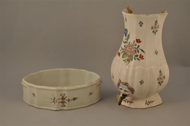 VARIA. FONTAINE et BASSIN en faïence de grand feu. Décor polychrome de fleurettes et bouquet fleuri. Fin du XVIIIème.