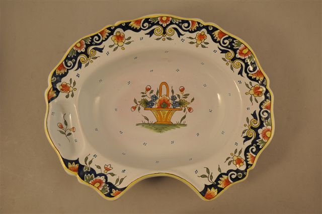 VARIA. PLAT à BARBE en faïence de grand feu dans le goût de Rouen, décoré d'un panier fleuri et d'une frise de fleurs. Haut. 7,5, Larg. 34, Prof. 27 cm.