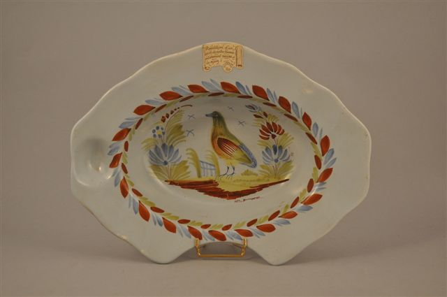 VARIA. PLAT à BARBE en faïence à décor de grand feu, orné d'un oiseau, signé HB Quimper. porte une étiquette "réedition d'un décor de notre musée entièrement réalisé à la main".