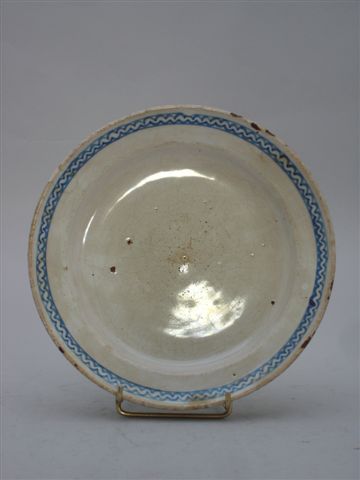 VARIA. ASSIETTE en faïence de grand feu, à décor en bleu en bordure. XIXème siècle. Diam. 24 cm. (égrenures).