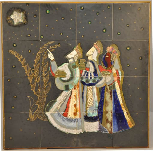 VARIA. Les Rois Mages. MOSAÏQUE de 16 carreaux de céramique. Signée en bas à droite.