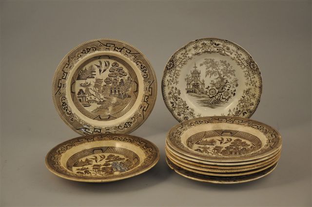 ANGLETERRE. NEUF ASSIETTES plates et creuses en faïence PRIMAVESI, à décor bistre oriental, modèle Colandine. Diam. 23,5 cm.