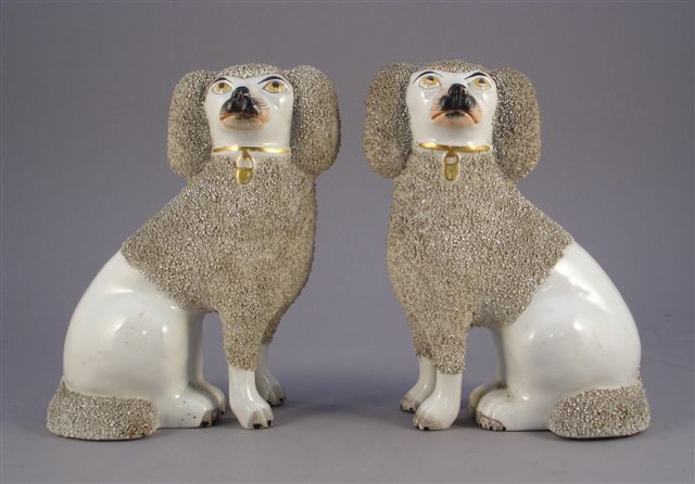 GRANDE-BRETAGNE. STAFFORDSHIRE. Paire de STATUETTES en céramique représentant des chiens assis. La partie antèrieure et la queue sont couverts d'éléments concassés imitant le pelage du chien.