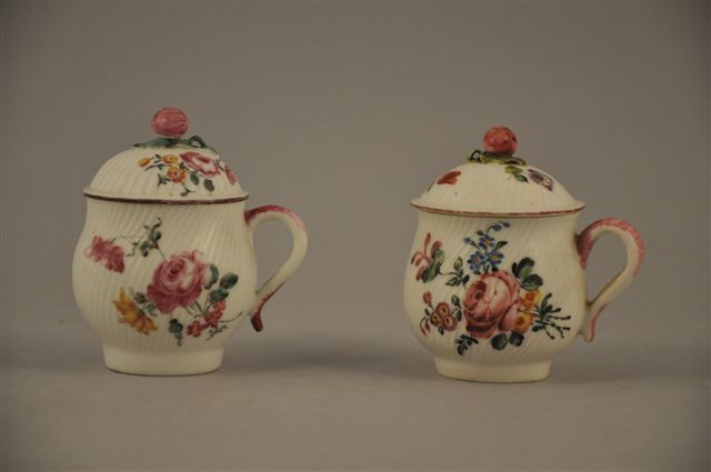 MENNECY. Manufacture du Duc de Villeroy. DEUX POTS à JUS en porcelaine tendre, le corps et le couvercle à fines côtes torses, à décor polychrome de fleurs au naturel, prise des couvercles en fruits. Marque en creux "D. V." . XVIIIème. Haut. 8,5 et 9 cm.