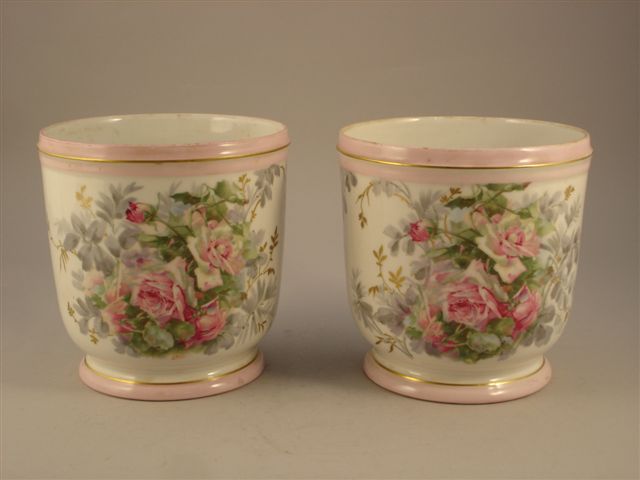 PARIS. PAIRE DE CACHE-POTS cylindriques, sur piedouches en porcelaine blanche à décor de roses et feuillages traités au naturel. Filets rose et or. Composition signée Warc. XIXème. Haut. 21, Diam. 19,5 cm.