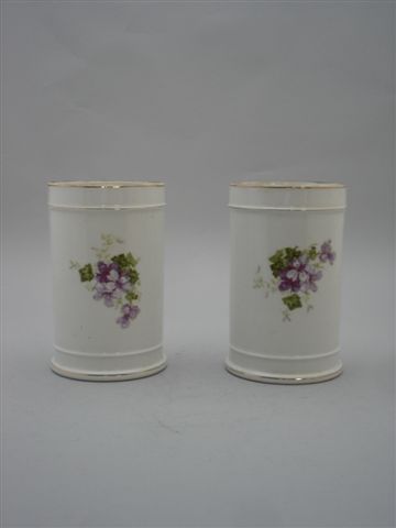PARIS. PAIRE de POTICHES de forme cylindrique en porcelaine blanche. Filet or. Décor de violettes. XIXème. Haut. 21 cm. Diam. 12,5 cm.