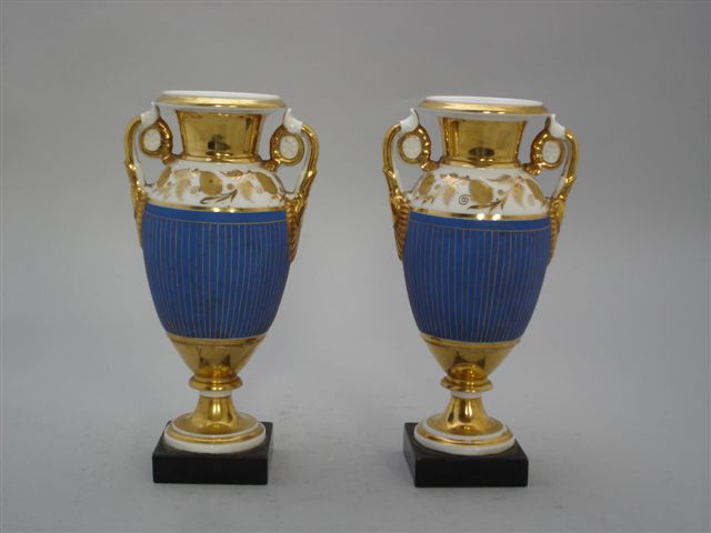 PARIS. PAIRE de VASES en porcelaine blanc et or sur fond bleu. Sur le haut de l'épaulement, un décor tournant de fleurs et feuillages. Les anses en enroulement dans le goût des urnes antiques. Début du XIXème. Haut. 24 cm.
