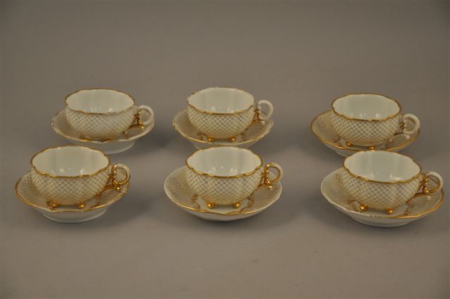 PARIS. Partie de SERVICE À THÉ en porcelaine blanche et dorée "résille" comprenant 6 tasses et 6 sous-tasses (deux tailles, Diam 13 et 14 cm). Porte une marque imprimée au revers : " ED. HONORÉ. Boul. Poissonnière N° 6 à Paris. Manufacture à Champroux. Allier"