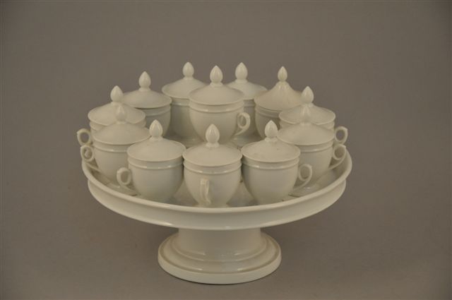 PARIS. SERVICE À CRÈME en porcelaine blanche comprenant 12 pots couverts munis d'une anse et un présentoir circulaire sur piédouche.